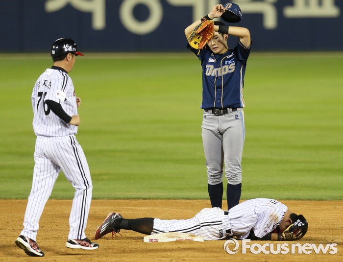 (서울=포커스뉴스) 11일 서울 잠실구장에서 열린 2016 프로야구 NC-LG 경기 4회말 1사 1,3루에서 LG 1루주자 손주인이 2루 도루를 시도해 슬라이딩하며 NC 유격수 지석훈의 글러브에 얼굴을 부딪쳐 그라운드에 쓰러져 있다.
