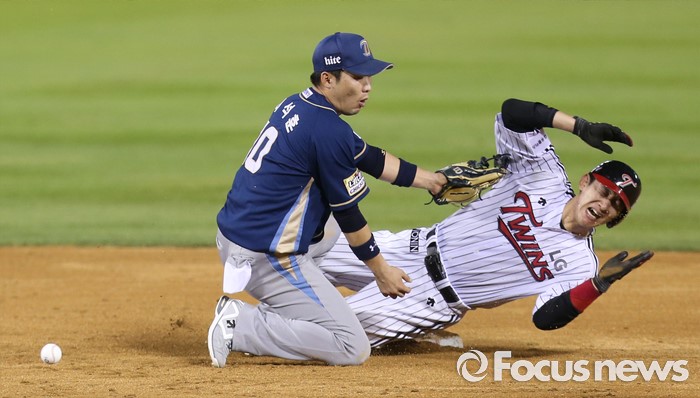 (서울=포커스뉴스) 11일 서울 잠실구장에서 열린 2016 프로야구 NC-LG 경기 4회말 1사 1,3루에서 LG 1루주자 손주인이 2루 도루를 시도해 슬라이딩하며 NC 유격수 지석훈의 글러브에 얼굴을 부딪히고 있다.