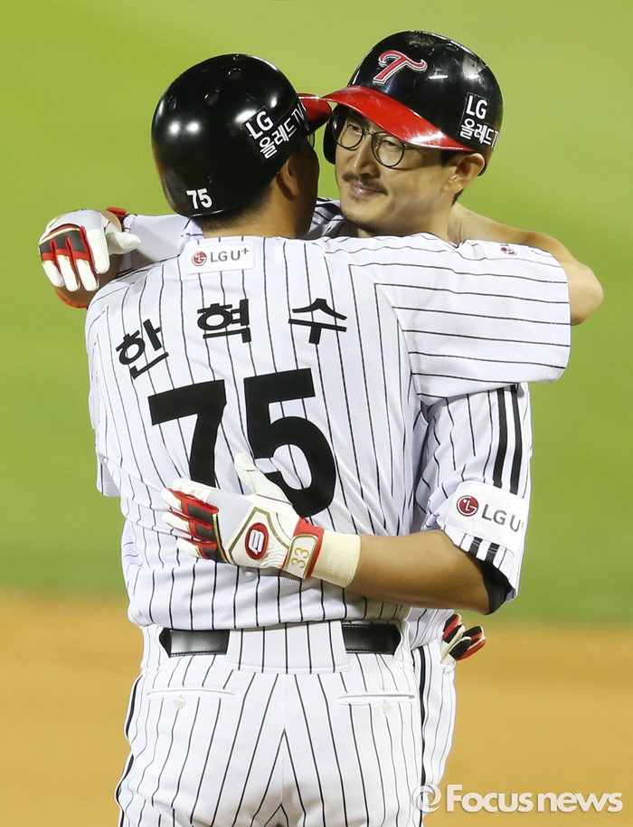 (서울=포커스뉴스) 11일 서울 잠실구장에서 열린 2016 프로야구 NC-LG 경기 7회말 2사후 LG 박용택이 우전 안타를 쳐 KBO리그 통산 6번쨰 2천 안타를 기록하고 1루에서 한혁수 코치와 포옹하고 있다.