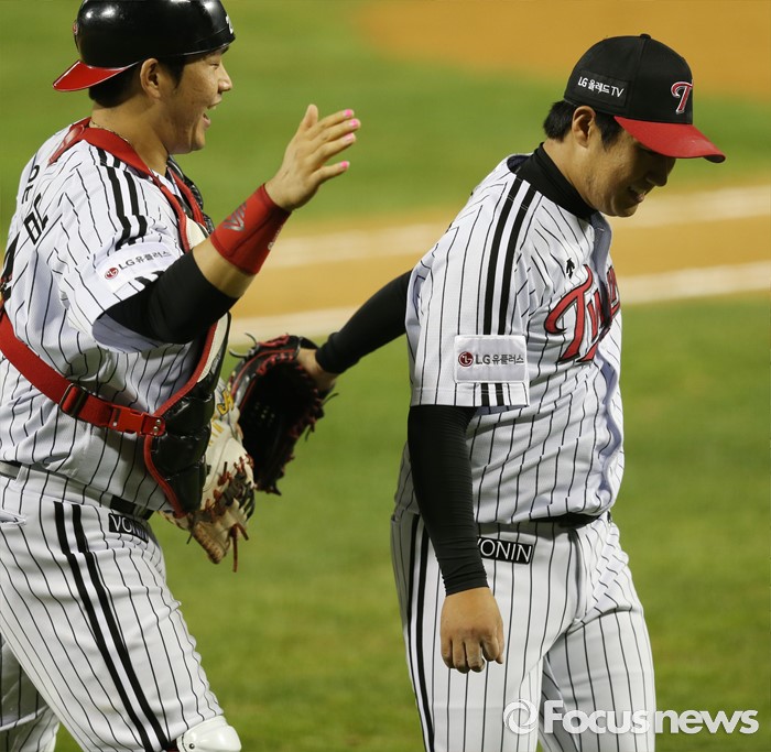 (서울=포커스뉴스) 11일 서울 잠실구장에서 열린 2016 프로야구 NC-LG 경기 7회초 2사 2,3루에서 LG 투수 김지용이 NC 모창민을 삼진 아웃으로 잡고 실점위기를 넘기며 포수 유강남과 함꼐 기뻐하고 있다.