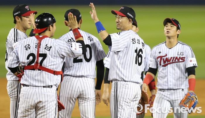 (서울=포커스뉴스) 11일 서울 잠실구장에서 열린 2016 프로야구 NC-LG 경기에서 NC에 4-2로 승리해 8연승을 한 LG 선수들이 마운드에 모여 하이파이브하고 있다.