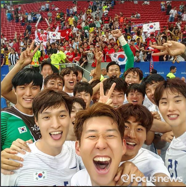 (서울=포커스뉴스) 대한민국 축구대표팀이 10일(현지시각) 브라질 브라질리아 마네 가힌샤 경기장에서 열린 리우올림픽 축구 C조 조별리그 3차전 멕시코와의 경기에서 8강행을 결정지은 후 관중의 휴대폰을 빌려 찍은 셀카에서 밝게 웃으며 승리를 자축하고 있다. <사진출처=starpyo 인스타그램 캡쳐>